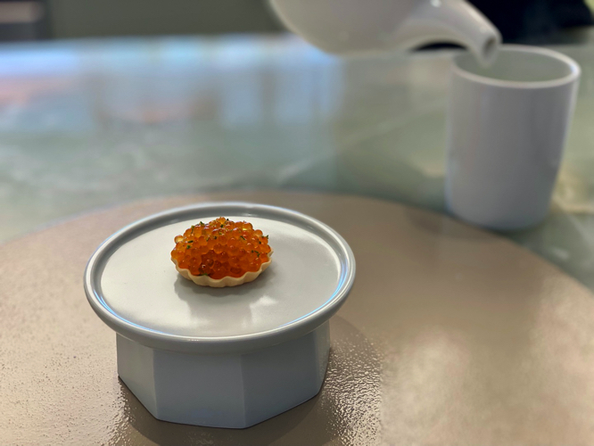 店名もEATANICとBOTANIC(植物)に寄せられて造語を作ってますよね。インテリアも大理石とブロンドをマッチさせて、重厚感と古典性を感じます。大きな窓から眺望できる江南の景色も素晴らしいです。何かこう、宮廷料理をヨーロッパ的に表現したイメージが湧いて来ます。