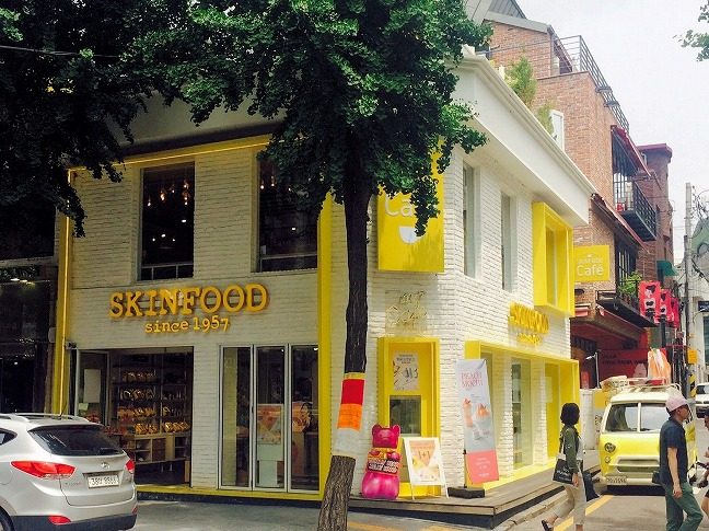 SKINFOODのコンセプトショップがカロスキルのど真ん中にオープン。黄色の目フォトジェニックな建物で、SNSやガイドブックに結構でてます。「食べて体にいいFOODをお肌にも」というコンセプトの創業50年の化粧品ブランド。1階は化粧品販売店なんですが、2階にスキンフードカフェがカロスキルだけにあるので、お買物後にカフェへ行ってみます。先ずは2階へ。店の奥から入れます。(カフェだけ利用の場合は別、店の後ろ側に入口有り)