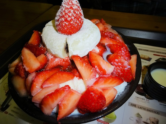 さて、韓国で一番人気はきな粉餅ソルビン(8000ウオン)。あとは季節のフルーツを使った期間限定のメニューや、抹茶味、マンゴーなど色々あります。注文するカウンターにはメニューの写真があるので、指さしで注文しました。5月の今はイチゴが人気のようでした。注文して支払いをすませると、ブザーをくれます。ブザーが振動したらカウンターまで取りに行きます。