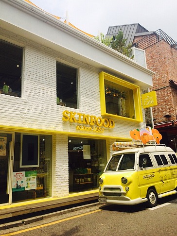 SKINFOODのコンセプトショップがカロスキルのど真ん中にオープン。黄色の目フォトジェニックな建物で、SNSやガイドブックに結構でてます。「食べて体にいいFOODをお肌に... -