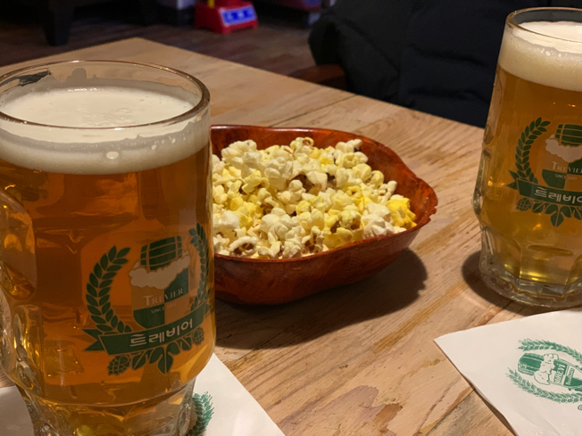 蔚山へ遊びにきて、ジャカジャカ飲んでます。寒ブリメインの超豪華コースの後は、二次会でビール🍻を飲もうということに。週末の10時ごろの繁華街の様子、とにかく飲食店が多い!そして、その中に大きな建物で地元で有名なクラフトビールのお店「トレヴィ트레비」へ