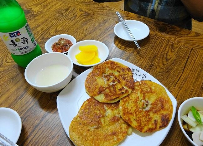 個人的には油でカリッと揚げた風のものが好みですが、ここのはしっとりとしたお焼き。3枚で一皿はマッコリとちょうどよい量です。一人でもこれぐらいは食べれます。マッコリはさっぱりとして、少し甘さがあるので飲みやすいです。