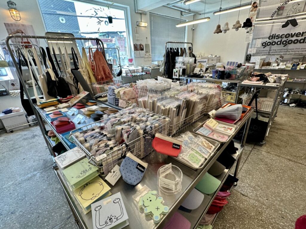 ここにあるのは、いわゆる「定番のお土産品」とは一線を画すアイテムばかり。現地のアーティストとコラボしたポストカードや、トレンドのシルバー、アクリル素材を多用した無機質でモダンなインテリア雑貨など、「今のソウルのライフスタイル」をそのまま切り取ったようなプロダクトに出会えます。