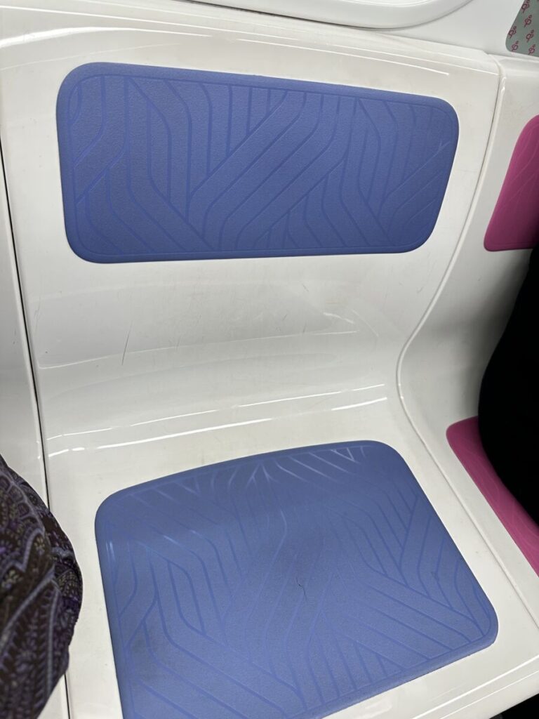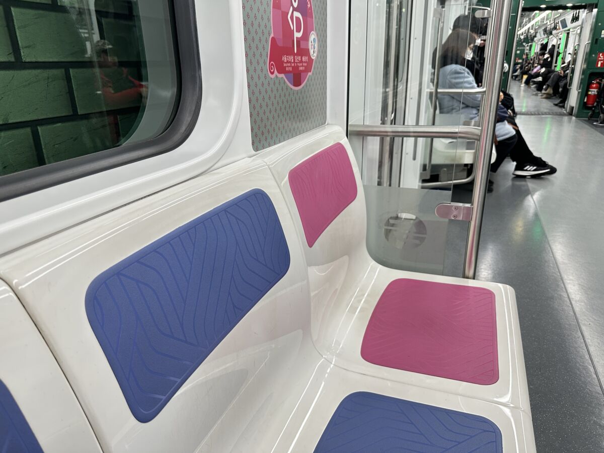 写真をよく見ると、青い座席が一般席、ピンクの座席が優先席(妊婦さんや高齢者向け)になっています。色でひと目で区別できるこの工夫も、韓国らしい細やかな配慮だと感じました。
