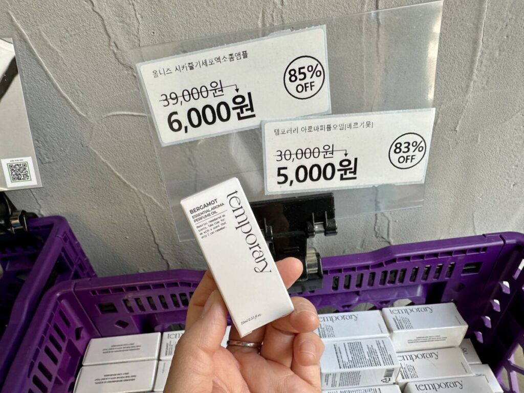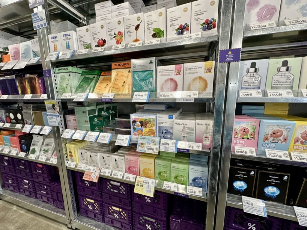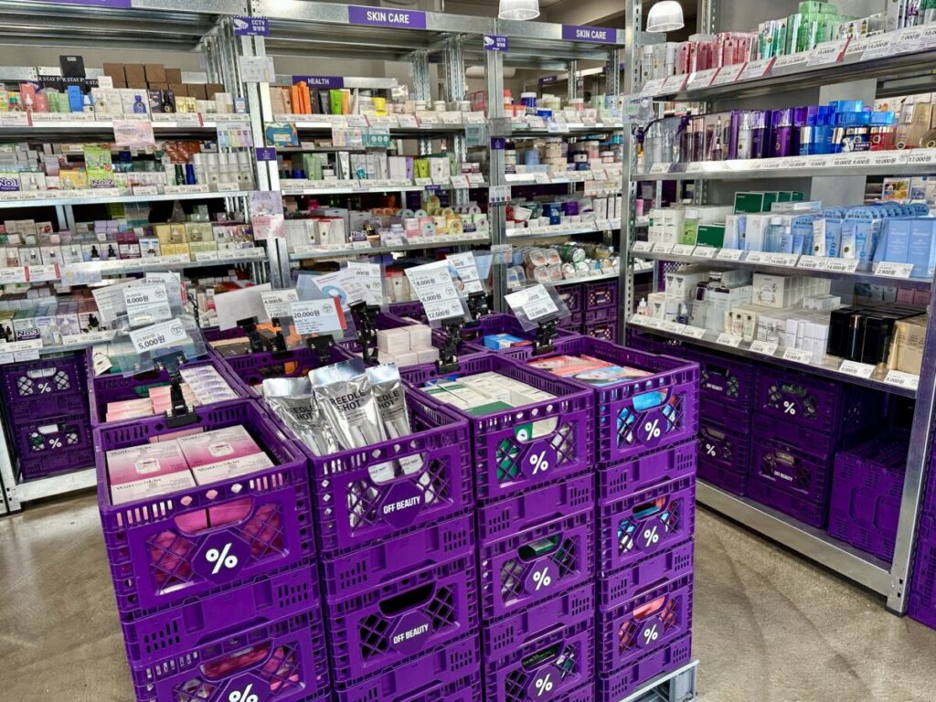 2025年5月に広蔵市場に1号店が誕生して以来、延南洞や望遠、東大門など主要エリアに続々とオープンしているビューティアウトレットです。紫色の外観が目印で、従来のドラッグストアとは一線を画す「倉庫スタイル」が特徴です