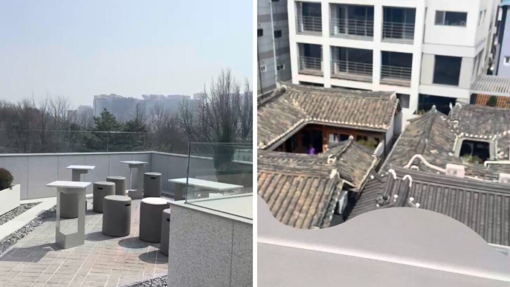 その静かな路地裏に佇むのが「PNA SEOCHON」です。このビルにカフェがあるとは分からないので、素通りするこ人が多いので、隠れ家スポットなんです!地元でも知る人ぞ知るカフェです。建物の4階へ上がると、目の前に広がるのは西村の街並み。この地域は韓屋保存地区なので、高いビルが少なく、ここは貴重なスポット!瓦屋根が連なる景色を高い位置から見下ろせる場所は意外と少なく、ここだけの特権と言えます。