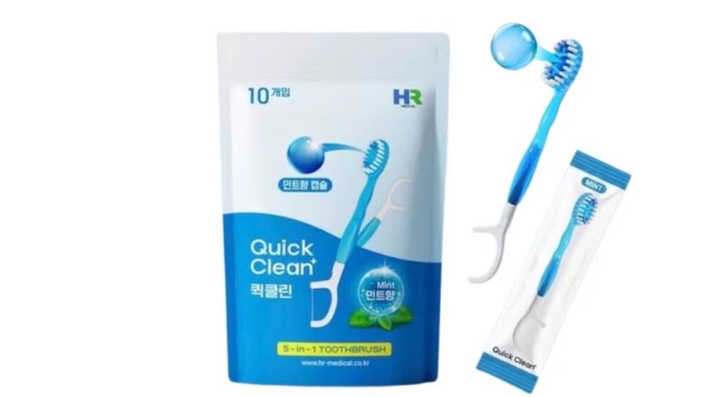 私が韓国に行ったら、買い求めるのがQuick Clean。製品の素晴らしいところは、「ピック・フロス・歯ブラシ・歯磨き粉・舌クリーナー」の5つの機能が非常にコンパクトにまとまっている点です。
