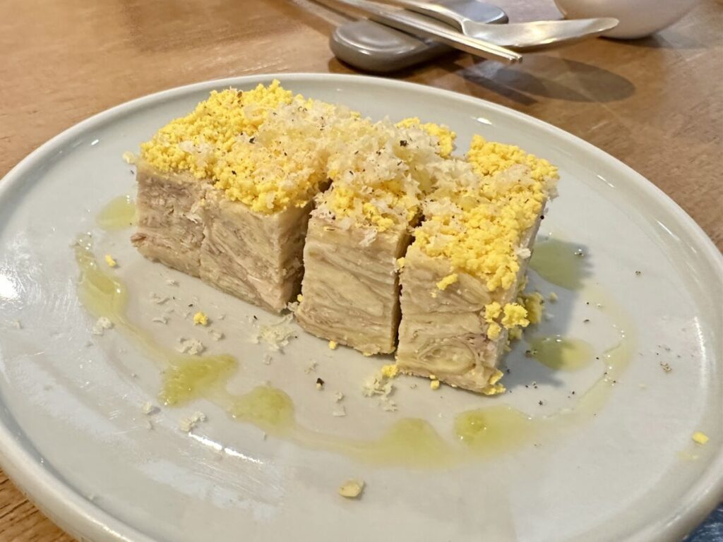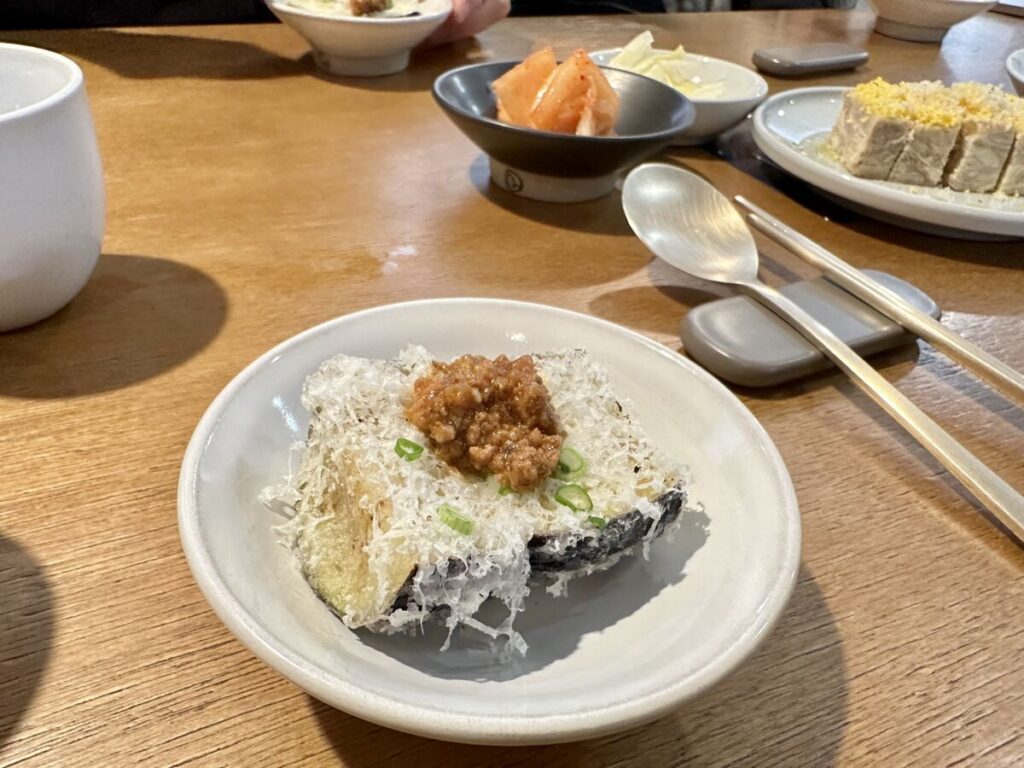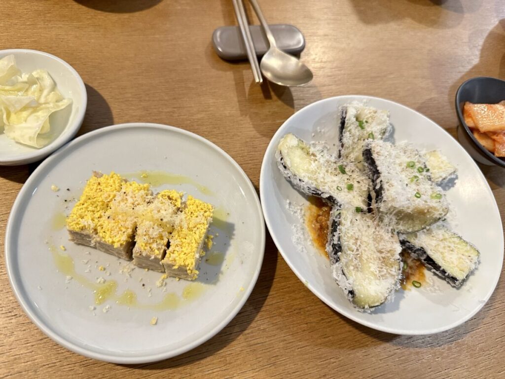 イタリアンな要素と韓国の様子が混ざり合ってるところが面白いんです!テーブルにはキムチがあり、前菜に鶏のコンフィとパルメザンチーズがたっぷりの茄子揚げが出てきます。