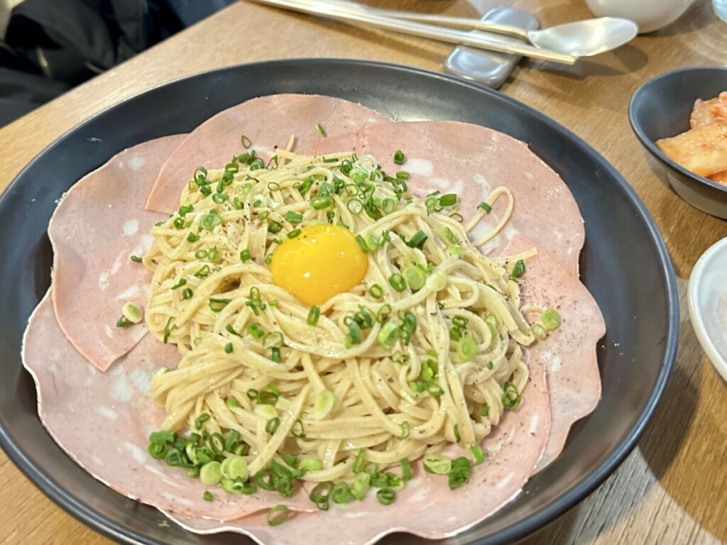 その他には、香ばしいえごま油の香りがたまらない「和え麺」スタイルも見逃せません。イタリア産のモルタデッラハムが添えられており、お客さん達は麺を包んで食べています。韓食とイタリアンの完璧なマリアージュで面白かったです。