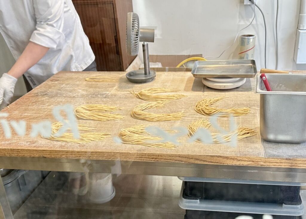 最大の特徴は、水を一切使わず卵だけで練り上げた自家製麺。噛むほどに卵の香ばしさが広がる麺は、パスタのようなコシと、韓国麺らしい喉越しを両立させています。製麺は店内で行っていて、様子がよく見えます。